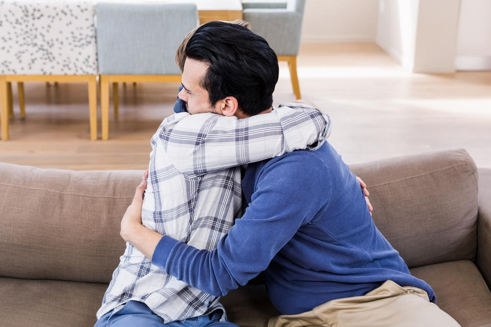 Gay couple hugging each other on the couch in the living room